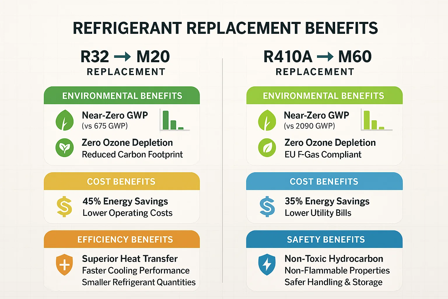 M60 and M20 are hydrocarbon-based refrigerants specifically designed to replace harmful gases like R410A & R32. With nearly zero Global Warming Potential and no damage to the ozone layer, it's the smart choice for homes and businesses that care about comfort and climate. Make the switch — for efficiency, for savings, and for a healthier future.